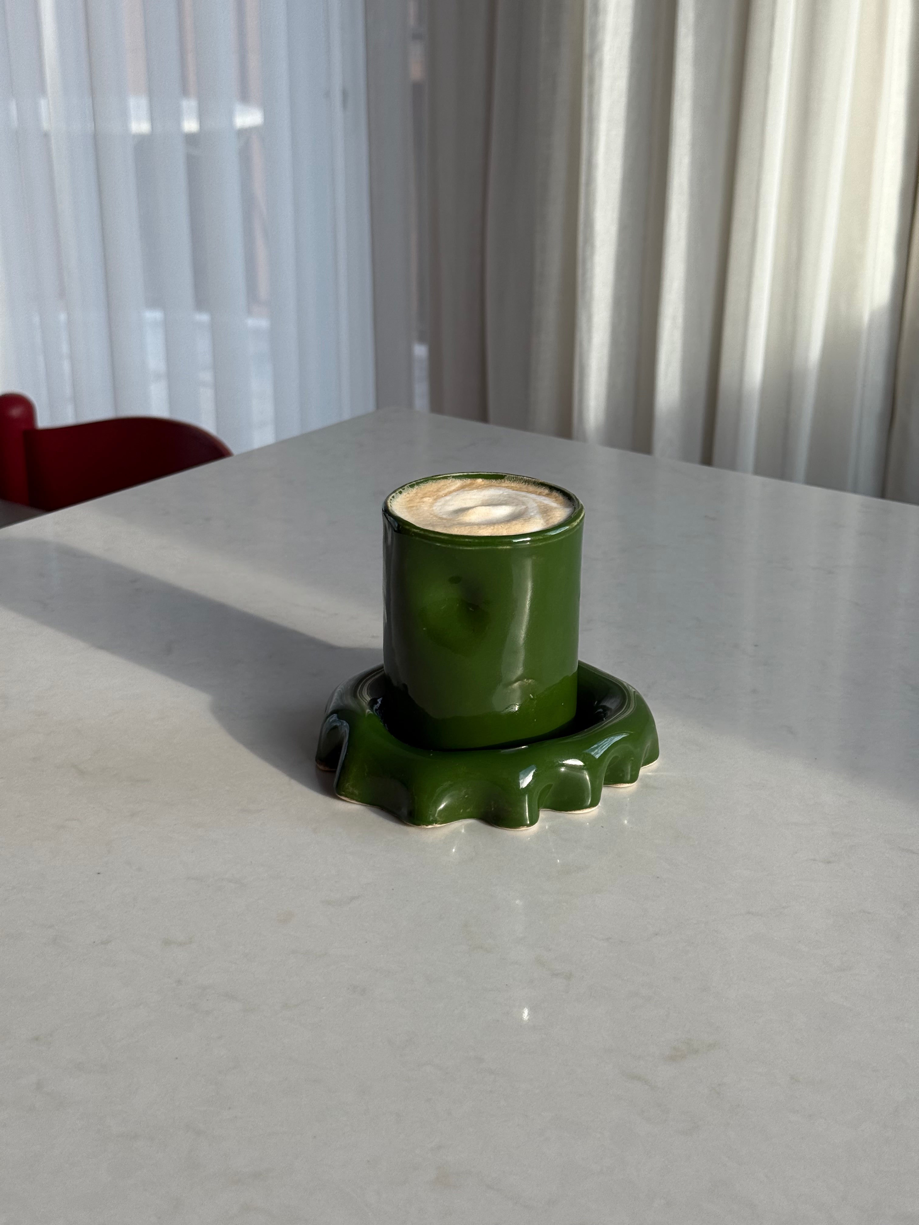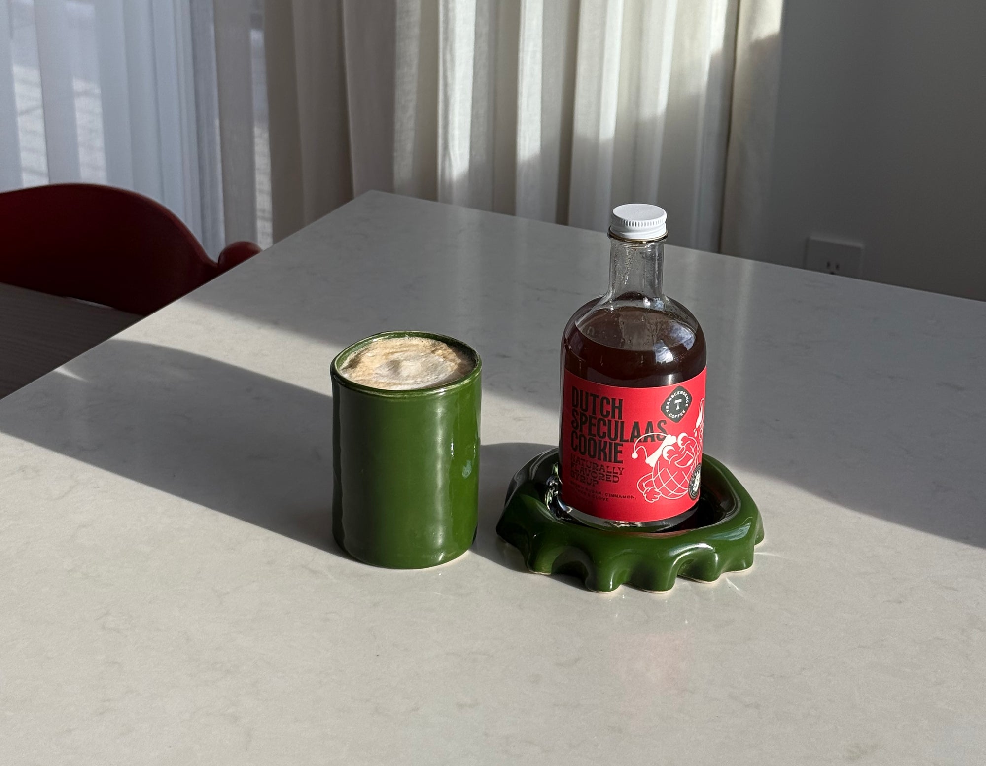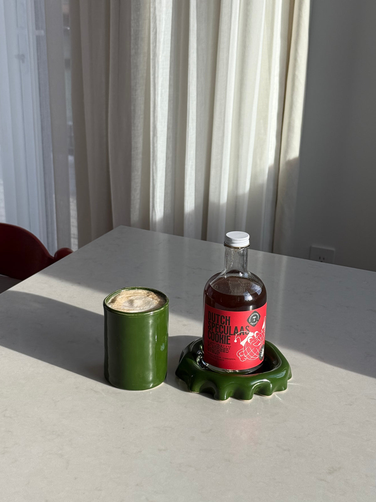 We dreamed up a piece that celebrates both of our worlds: Transcendence’s globally-inspired syrups and Gabby’s playful, handmade ceramics. Each mug + saucer set is in our signature dark green crafted by hand, start to finish, which means every piece has its own tiny quirks and charm.